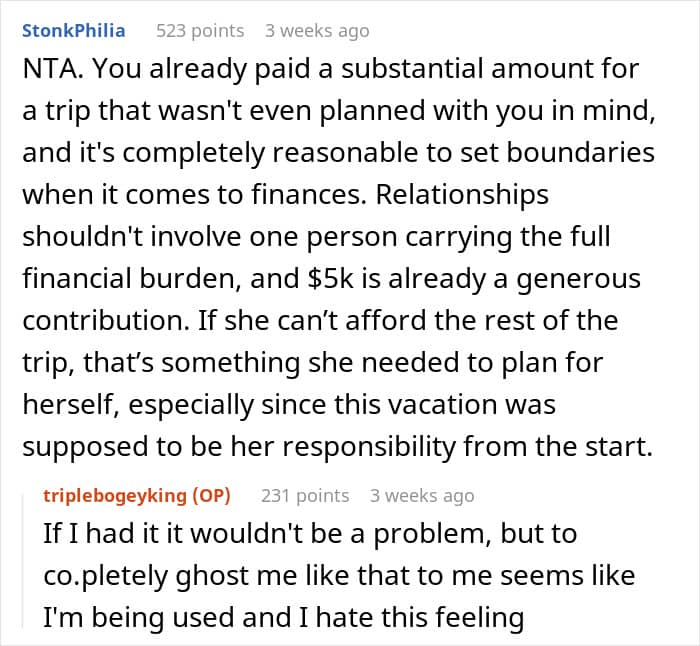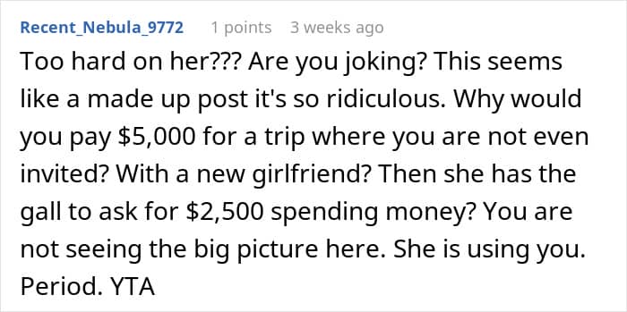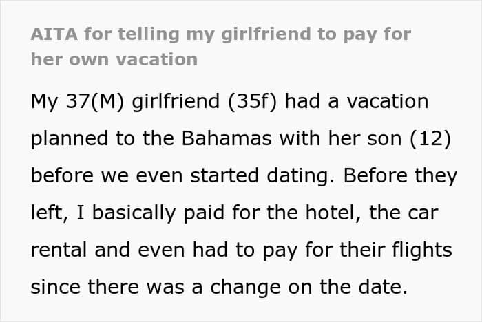 This Redditor paid $5K for his girlfriend and her son’s vacation, hoping they’d have a memorable trip together. However, when she later asked for another $2.5K, he refused, feeling he had already contributed more than enough. She’s been giving him the cold shoulder ever since, so now he’s asking the internet for help.