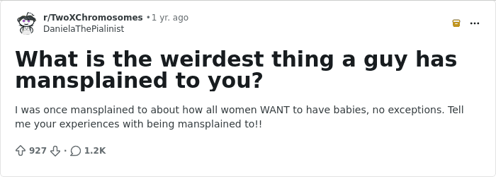 That’s the thing about mansplaining: it shows up when you’re least asking for it, usually delivered with a confidence that doesn’t match the facts. And it’s rarely limited to cameras. Women on Reddit shared the most bizarre, patronizing “lectures” they’ve gotten from men, and some of them are so ridiculous you can’t help but laugh. Scroll down to read their stories.