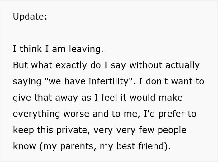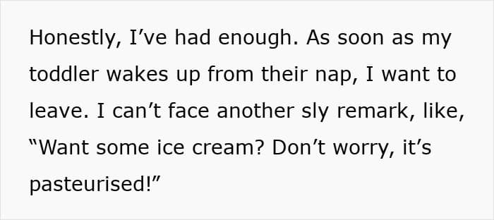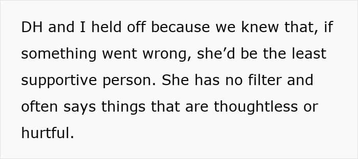 Despite the OP’s husband stepping in and asking his mother to stop, she brushed it off, claiming she was “just excited” for when another baby would come along. For the OP, after enduring a miscarriage earlier in the year and the stress of IVF, she felt drained and was ready to leave.