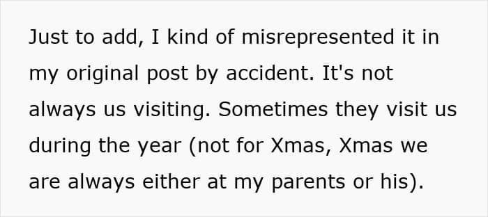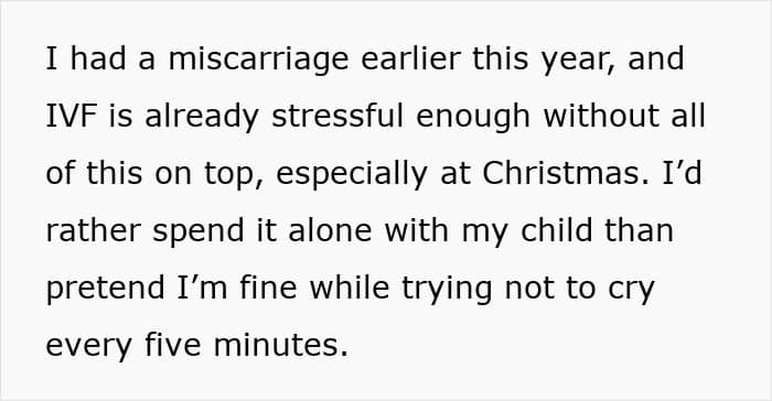 The OP, who has secondary infertility, shared that she and her husband have been trying for another child through IVF—a process they chose to keep private. The couple already have a toddler and, like many families, alternates Christmas visits between both sets of grandparents.
