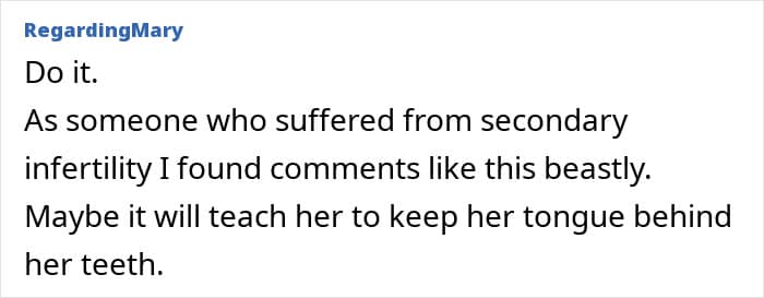 During this Christmas visit, the OP’s mother-in-law referred to pregnancy non-stop. From snide remarks about food choices to digs about ride restrictions at a fair, she constantly hinted at the OP getting pregnant again.