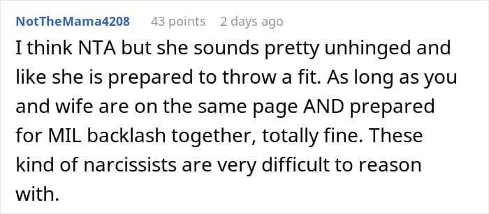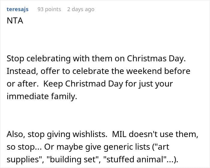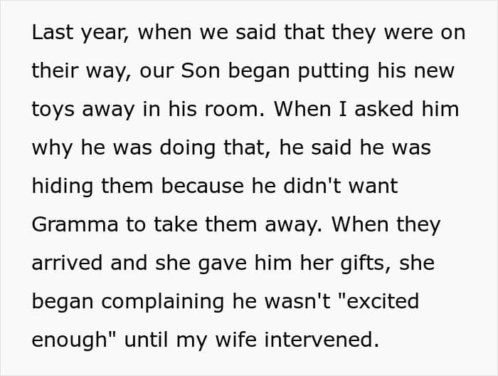 By setting the “no gifts” rule, the parents are doing exactly what experts recommend: establishing a firm boundary to protect their children’s well-being. They weren’t trying to punish the granny, they were just protecting the magic of Christmas from her competitive tendencies. Their decision creates a space where the focus can be on family time and genuine connection, not on a high-stakes battle for their son’s affection.
