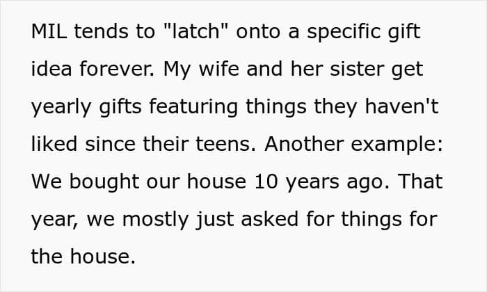 This MIL’s approach to Christmas was one of competitive, self-centered generosity. For years, she has demanded detailed gift lists, only to completely ignore them in favor of whatshethinks her family should want. Her signature move is “latching” onto an idea and never letting go, a quirk that resulted in the family receiving new towels every Christmas for six consecutive years.