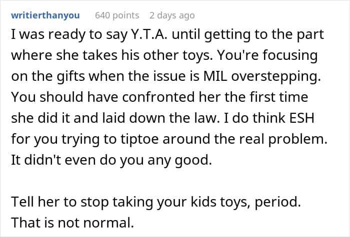 The next year, the damage was already done. The boy, now four, was seen proactively hiding his new Christmas toys before his grandmother arrived because he was afraid “Gramma will take them away.” Instead of showing a shred of self-awareness, the MIL then had the audacity to complain that he wasn’t “excited enough” abouthergifts.