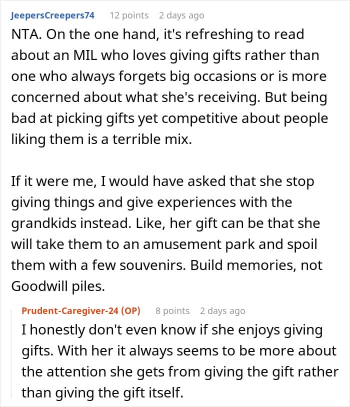 A mother-in-law’s gift-giving was less about generosity and more about competition