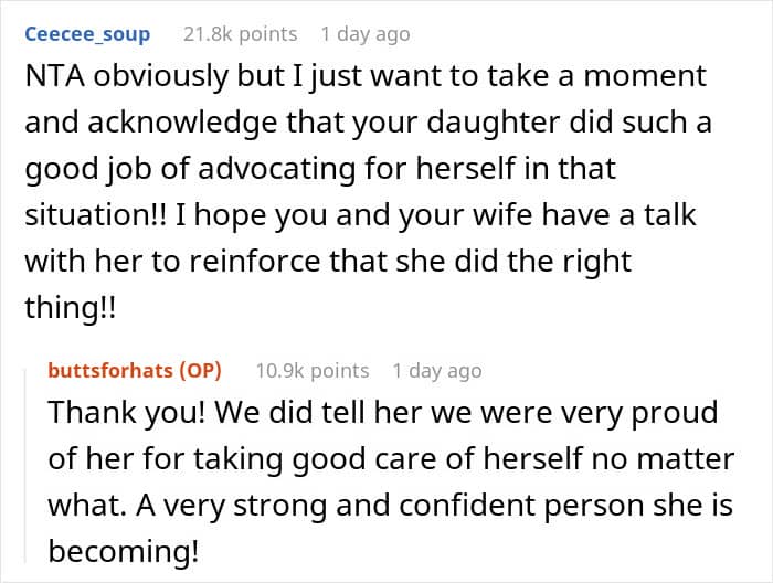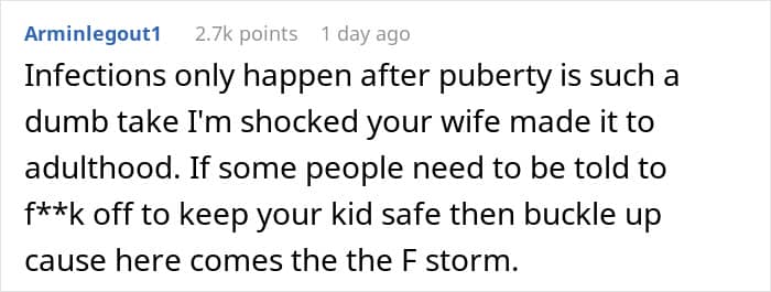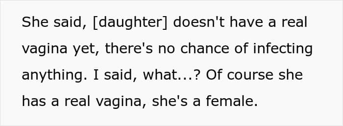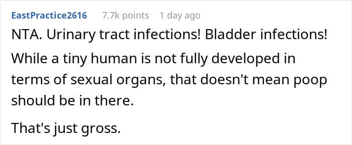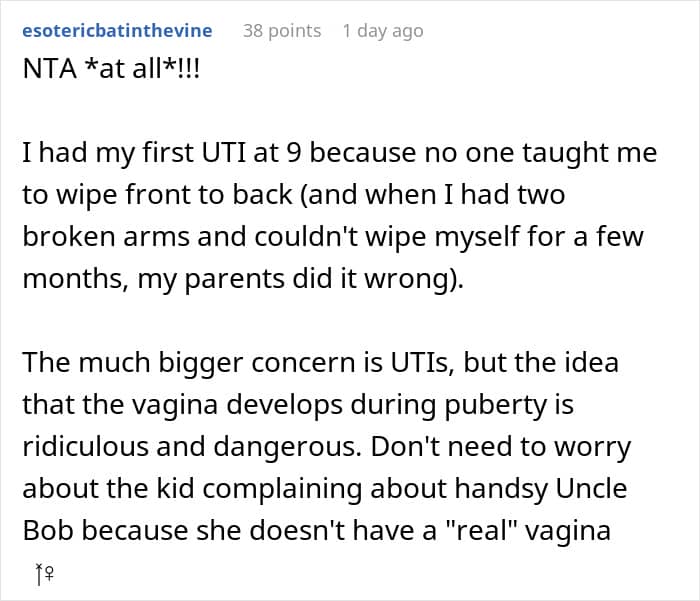 “My wife spoke to her mom about it extensively. MIL said it was due to upbringing, she grew up in a strictly Christian household with very reserved parents that told her and her sisters (she was one of four girls) that once they got their period as a teenager is when it actually became a functioning vagina and before that, it was just for peeing. She legitimately believed there actually wasn’t a real hole or anything there, just the beginning of an opening that would open up fully after their first period. They were also forbidden from using anything but pads and things like sex education were not discussed. I do not hold her at fault for not knowing how to wipe my daughter,” he added.