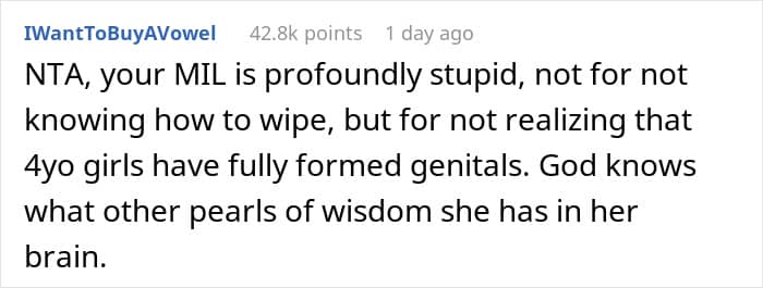 Redditor u/buttsforhats made sure his daughter knew the right ways to do it. He told the AITA community that he and his wife taught her how to wipe correctly; however, to his surprise, his MIL was lacking such knowledge. Not only that, she didn’t think her granddaughter had “real” parts down there at all. Scroll down to find the OP’s story in his own words.