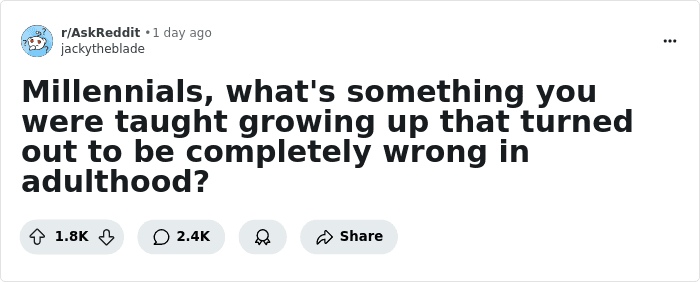 Gen Y has had to learn and adapt to so much with changing cultures, trends, and attitudes. The only thing is this list definitely makes it seem like a lot of what they were taught about life was really misleading.