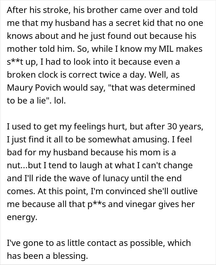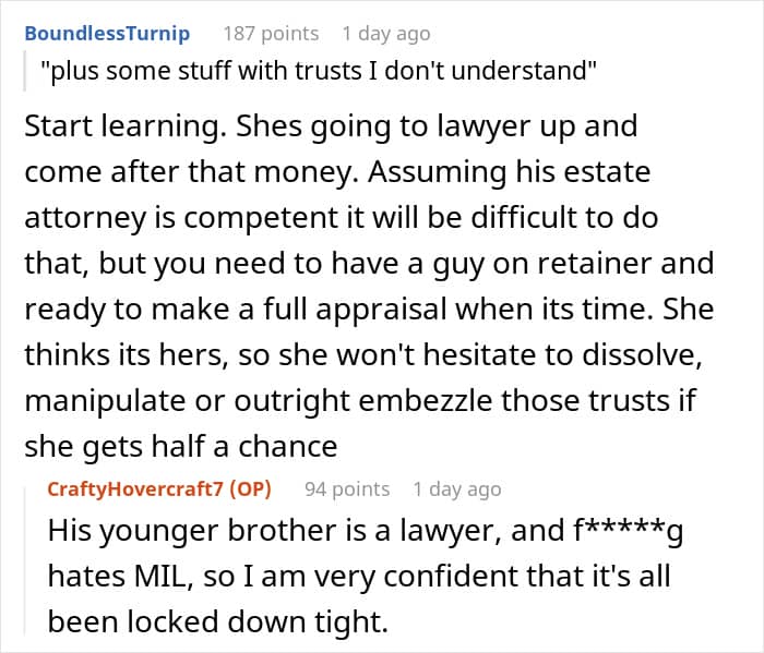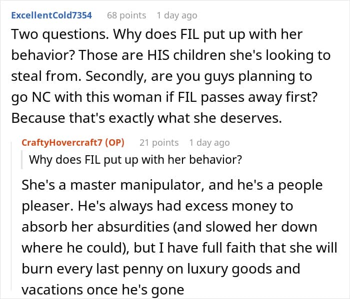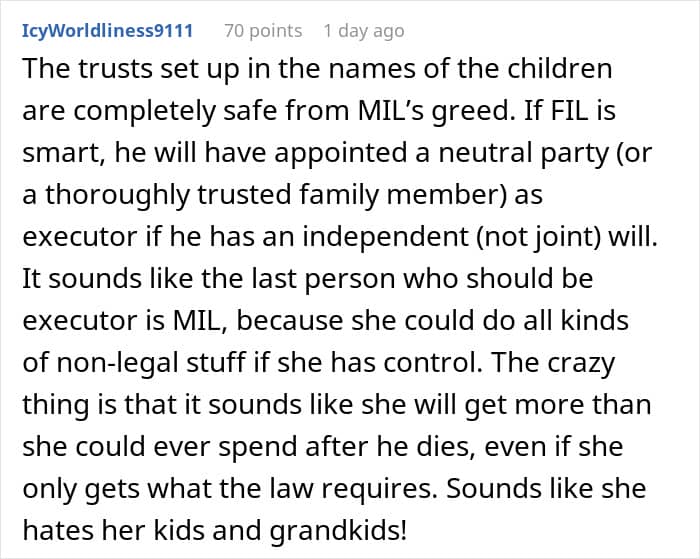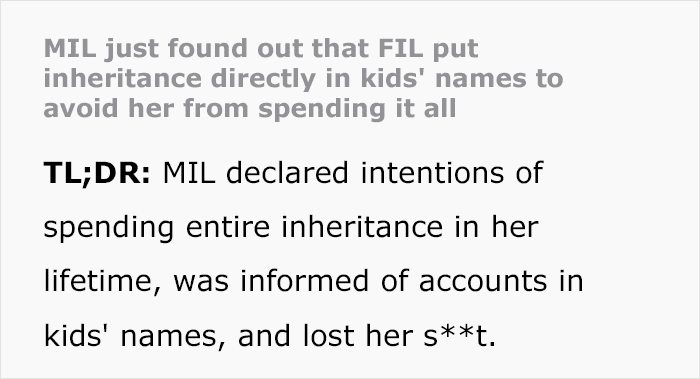 A man shared his particularly horrific “bad mother-in-law” tale with the internet after she flipped out when she learned her husband had made investment accounts for his kids so they would get at least some of his money. We reached out to him via private message and will update the article when he gets back to us.