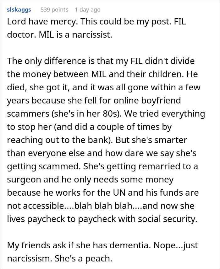 This story is a textbook example of how financial entitlement can turn a family tree into a battlefield. Inheritance is notoriously one of the leading causes of long-term family feuds, often because it forces deep-seated resentments about favoritism, control, and worthiness into the light. According to research on why families fight over money, these conflicts are rarely about the actual dollars and more about what the money symbolizes: love, power, and validation. When the mother-in-law declared her intent to leave nothing, she wasn’t just talking about a bank balance, she was attempting to exert ultimate control over her children’s futures and emotional well-being.