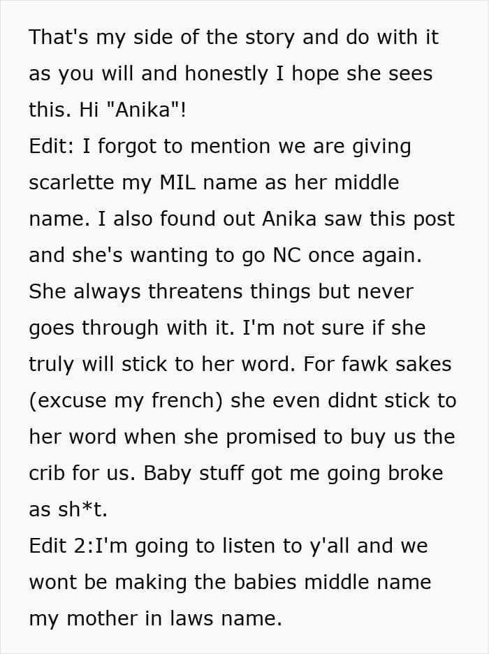 When the woman told her mom-in-law she wouldn’t be naming the child after her, she freaked out, threatened her, and said she’d go no contact