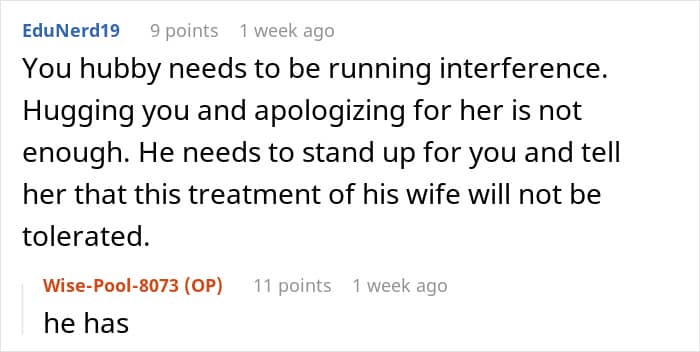 Luckily, the poster’s husband took her side and had a stern talk with his mother. He was also willing to distance himself and his family from his mom to protect his wife’s mental peace. This kind of support from one’s partner can really help in situations where in-laws are inconsiderate or overbearing.