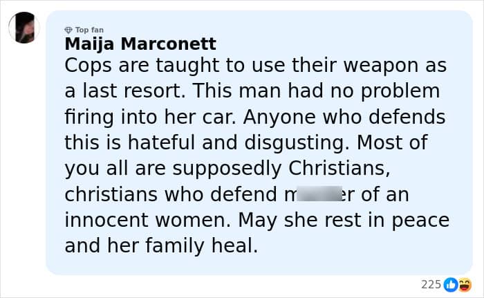 “As she was trying to move forward, one of the ICE agents stepped in front of her vehicle and reached across the hood and fired his weapon about three or four times and sh*t her in the face,” she continued.