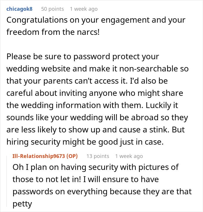 In today’s wedding drama, the original poster (OP) tells us how she finally put her foot down against her toxic parents. They were nothing but trouble, right from her engagement to before her marriage. Her mom was mad that they were having the wedding abroad, while her dad was pissed that her fiancé didn’t even ask for his “blessing” before proposing.