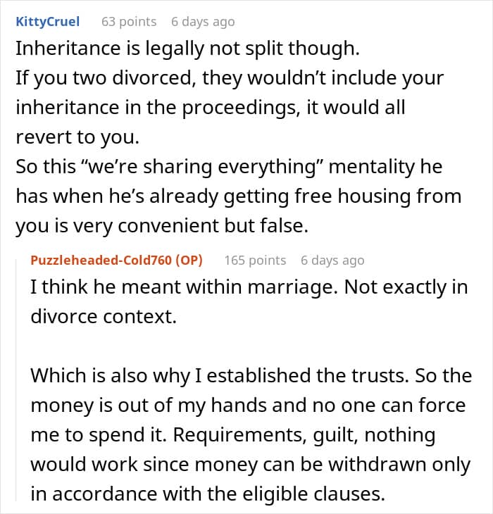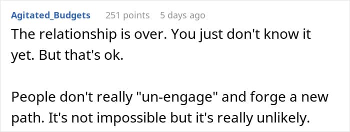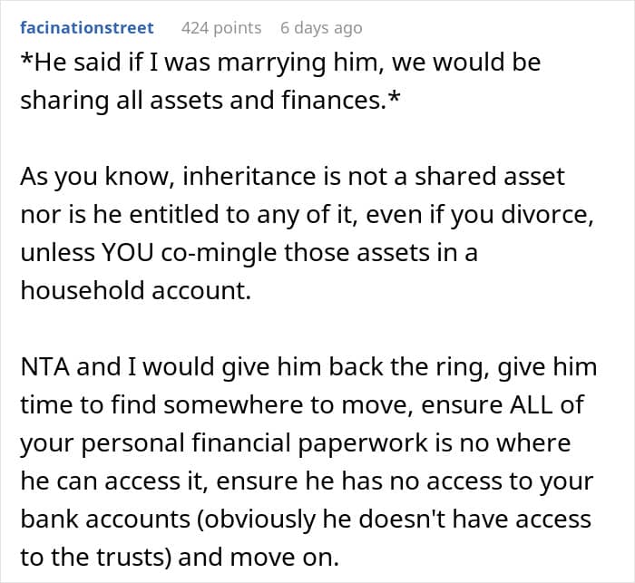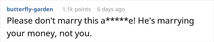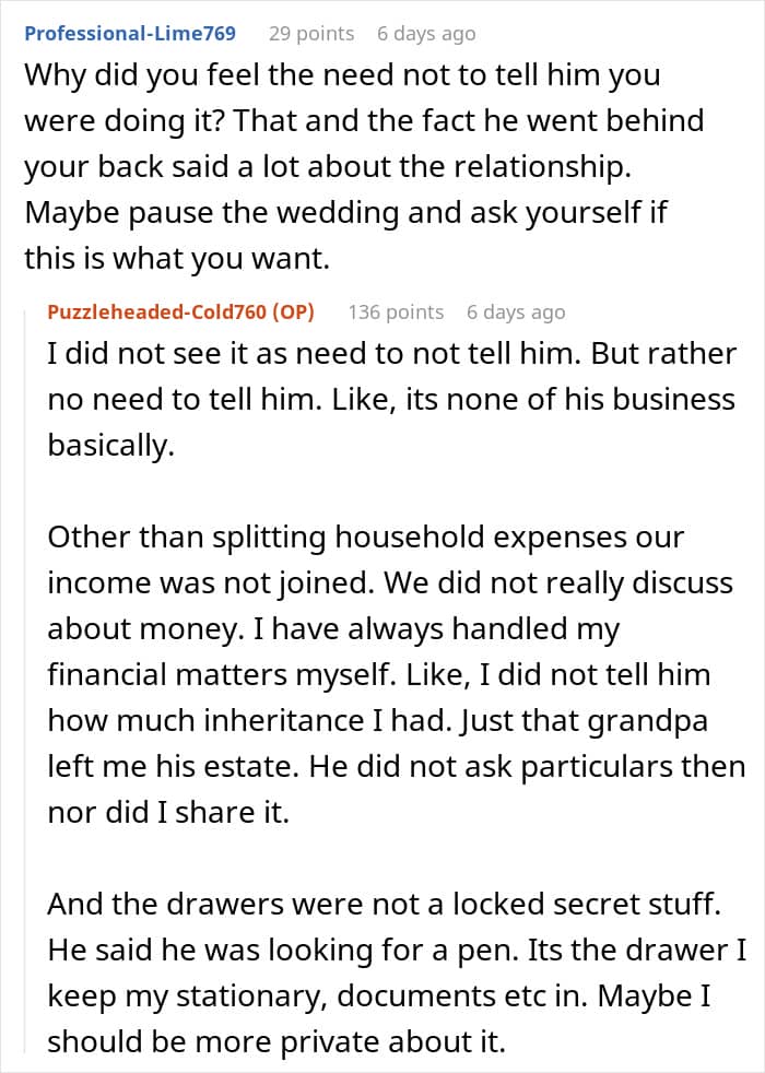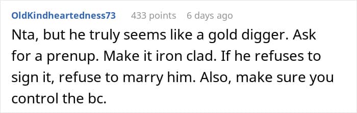 In the United States, people are typically not obligated to share their inheritance with their spouse. However, if disputes over inheritance arise during a divorce, it sometimes becomes common property between both parties, depending on state laws. But in this case on Reddit, it was likely wise for the mother to hold off on any wedding planning, at least for now. It’s not worth it to tie the knot if the issue of inheritance will keep surfacing.