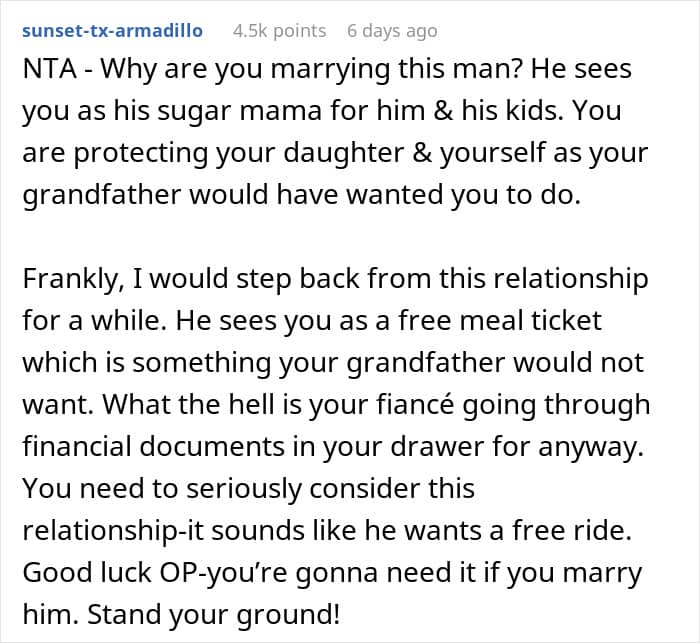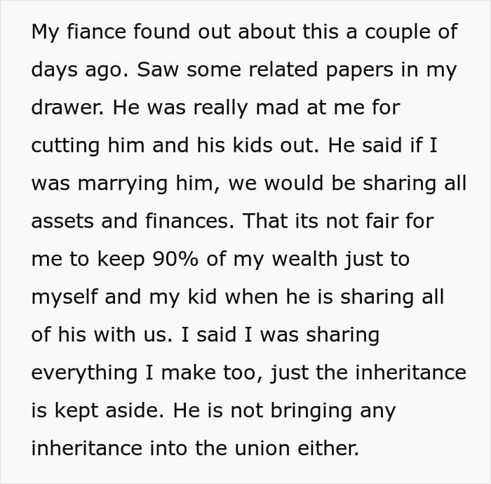 But finances are one of the top issues couples fight about, and for one couple, determining how a mother’s inheritance would be split led to calling off their wedding altogether. Below, you’ll find the full story that the mom shared on Reddit, as well as an update and some of the replies invested readers shared.