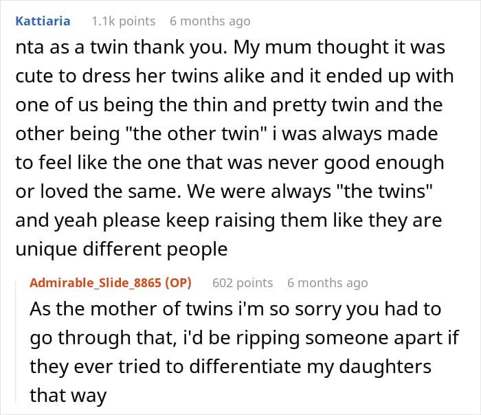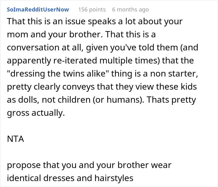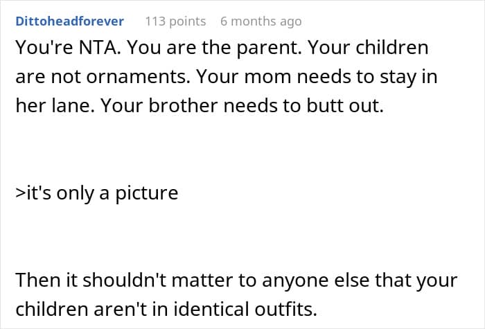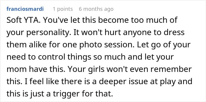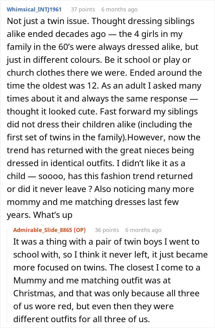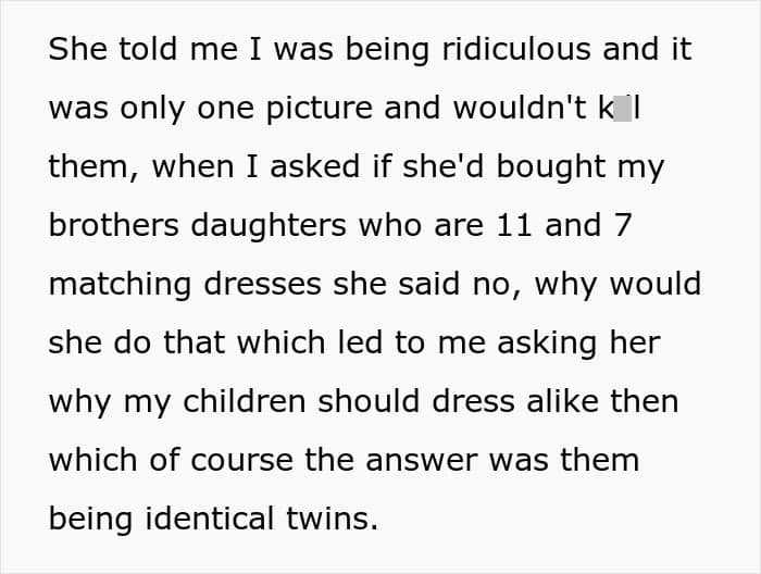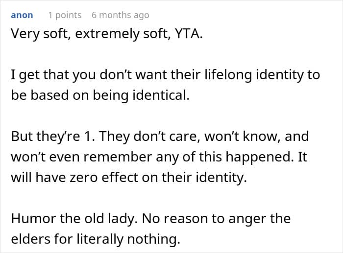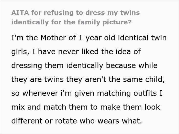 For example, a mother of 1-year-old identical twins faced family backlash when she chose unique outfits for her daughters in family photos to foster their individuality. Her own mother got upset, insisting on matching outfits for the twins. Keep reading to see how it all unfolded.