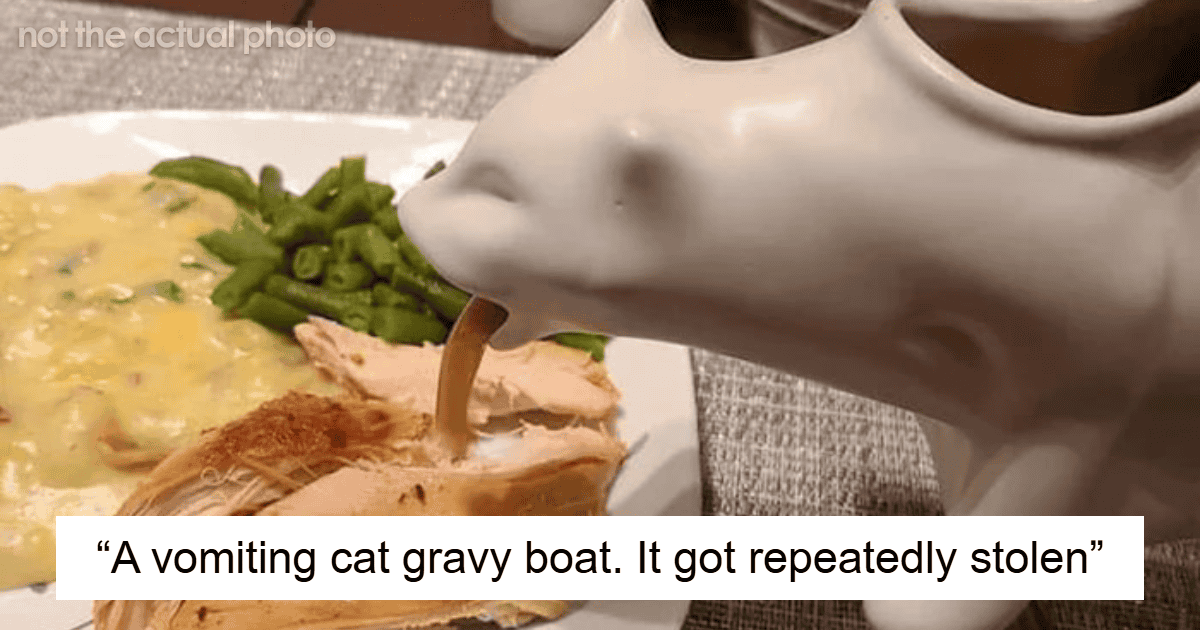 Someone gave me a vomiting cat gravy boat for my birthday one year, and although I am admittedly immature as [hell] I am also a good cook and have no interest in making family members associate my holiday gravy with cat vomit. So I brought the thing to the work white elephant party and it got repeatedly stolen. Better them than I.