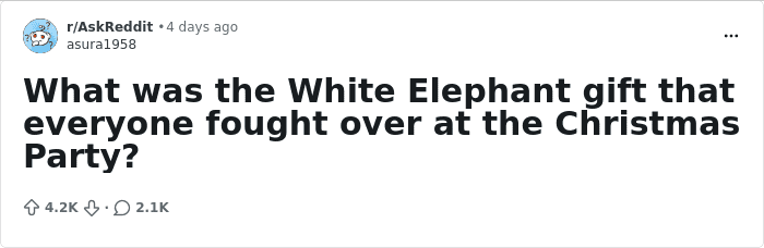 I had a desk job at Knott’s Berry Farm in 1999 and we had a white elephant, the gift everyone fought over was a goldfish Christmas ornament with giant cartoony lips. Pretty sure that’s the only white elephant I’ve been to.