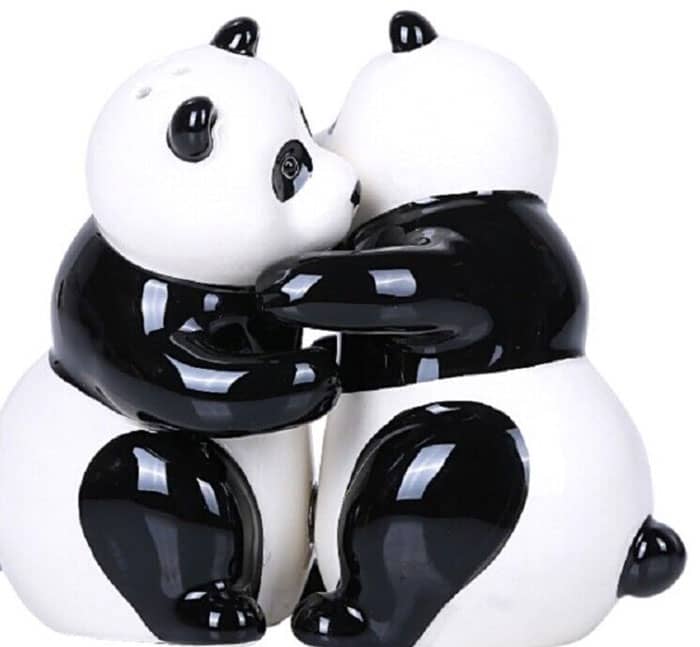 A set of salt shakers that looked like pandas side-hugging eachother and sitting on a leaf shaped dish.