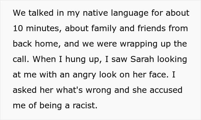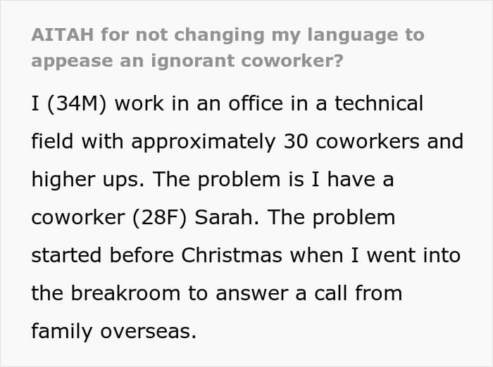 One office worker went viral after sharing the nightmarish situation his colleague dragged him into, and asking the AITAH community for its thoughts on the workplace drama. According to the man, his coworker overheard him speaking with his family on the phone in his native language. She accused him of racism and immediately reported him to HR, all because a common word he’d used sounded like a slur in English. You’ll find the full story below.