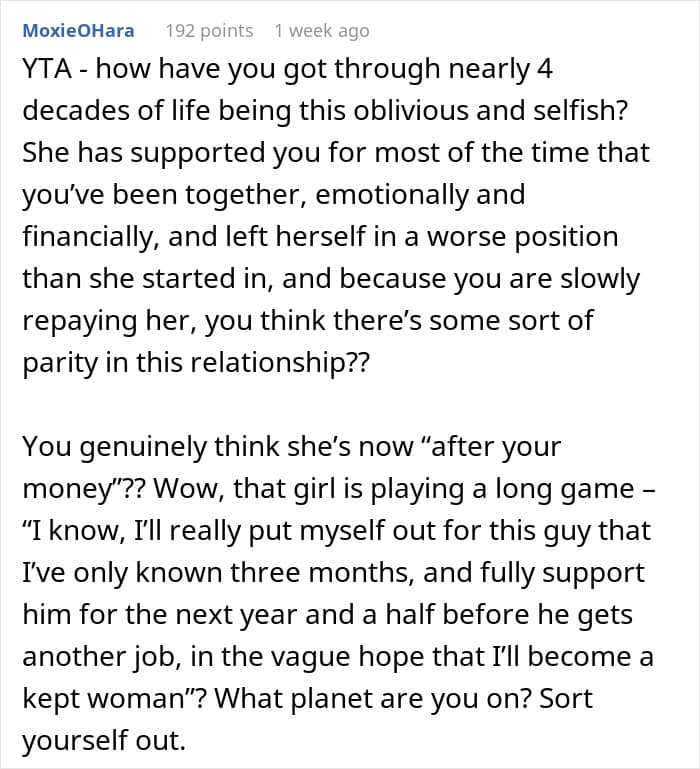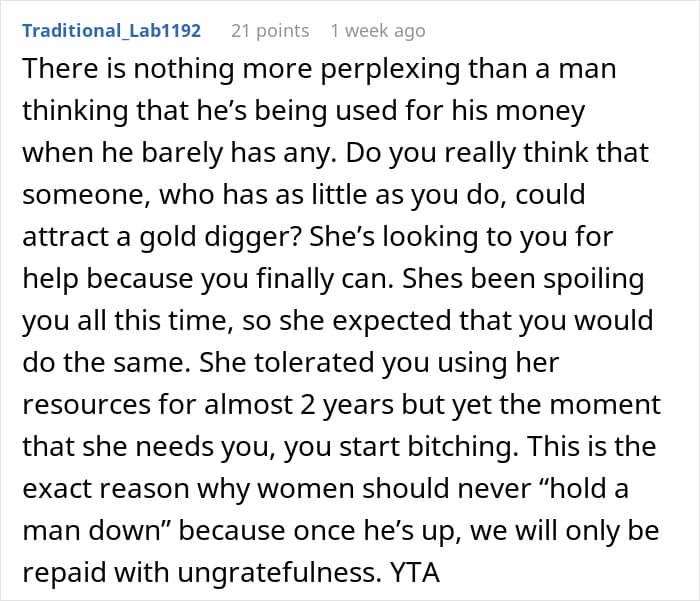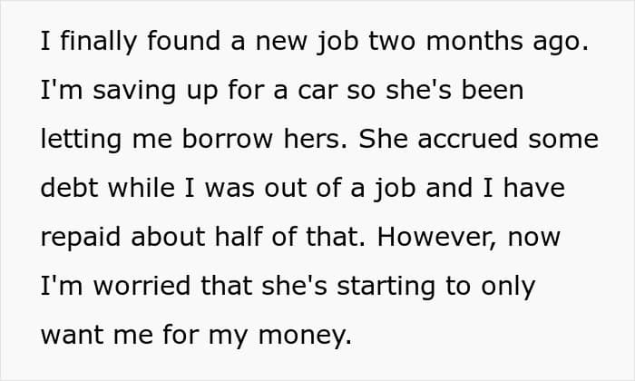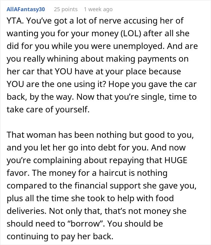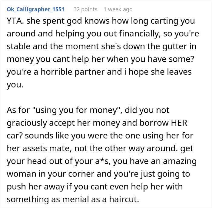 When one guy lost his job just three months into a new relationship, he was lucky enough to have his girlfriend support him for the next year and a half. She stood by his side and helped him dig his way back up. Now that the guy’s finally found a job, he suspects his girlfriend is only after his money. And when she recently asked him if she could borrow a few bucks for a hair appointment, he refused. After some introspection and a massive fight, he’s wondering if he was maybe a little too selfish.