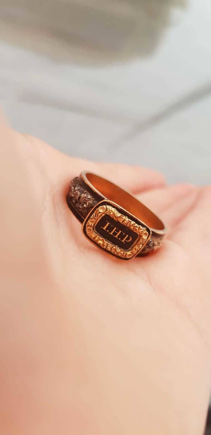 Answer: It’s a Georgian/early Victorian mourning ring. The initials belong to the lost loved one.