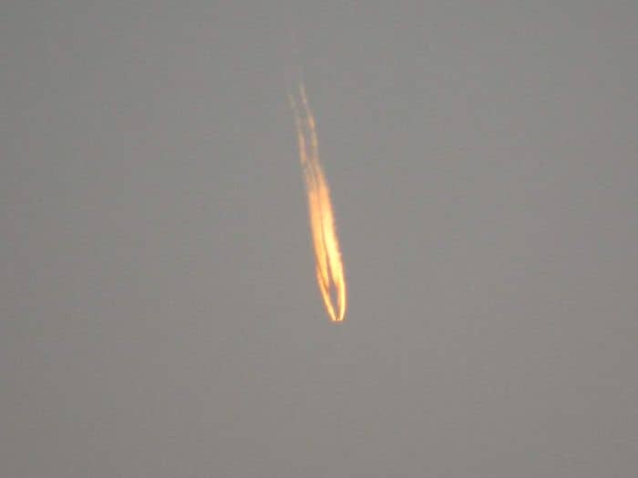 Answer: it’s a residue of a rocket launch. It’s called Twilight effect. It was done right at sunset so the sun lit the vapor/exhaust trail from underneath.