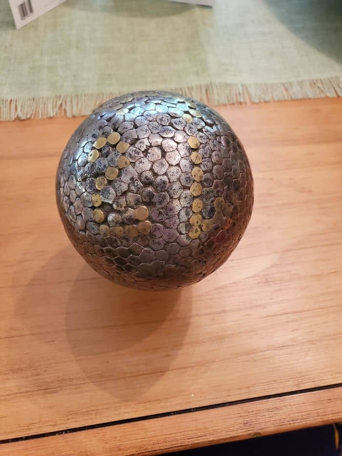 Answer: It’s a pétanque (boule) ball. It’s a game similar to Bocce ball. Players throw metal balls like this at a small wooden ball and score points by getting closer than their opponents. It’s a pretty popular game, if you live in or near a major metro area you can probably find a group that plays near you.