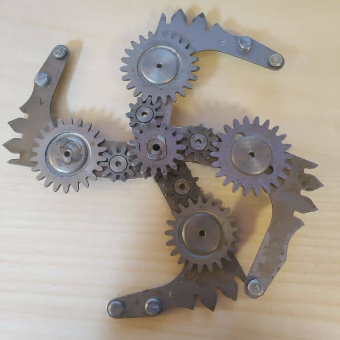 Answer: I found a item similar (I would rather say identical): It looks to me to be part of a mechanical calculator, more specifically the pick-up gear assembly. The arms should be attached, then the outer “teeth” will engage appropriately with buttons or display figures.