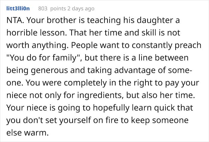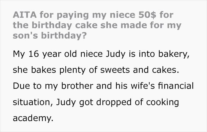 “AITA for paying my niece $50 for the birthday cake she made for my son’s birthday?” wonders the Redditor Wagon-1569 on AskReddit. At first glance, the question sounds odd. What is wrong with supporting the 16-year-old’s baking hobby? But here comes yet another family drama in the books, where everyone seems to have their own truth.