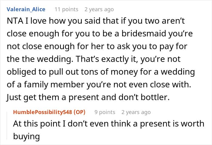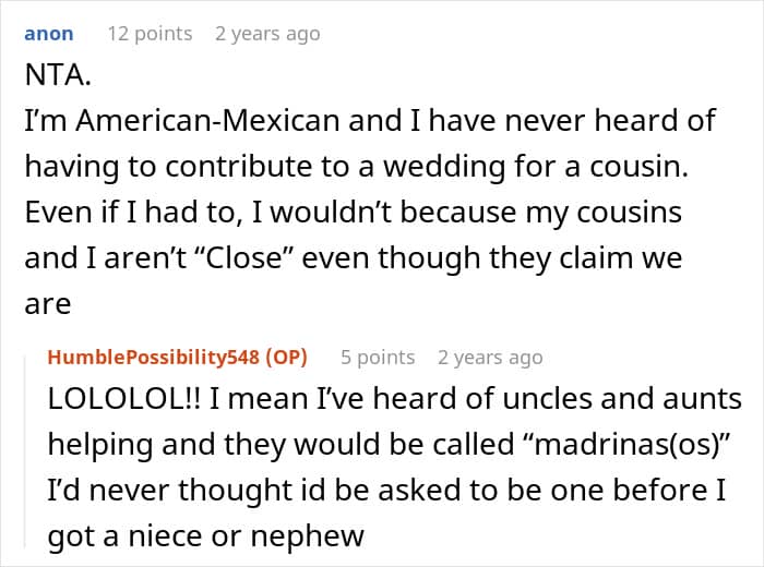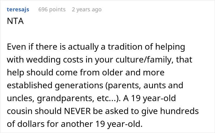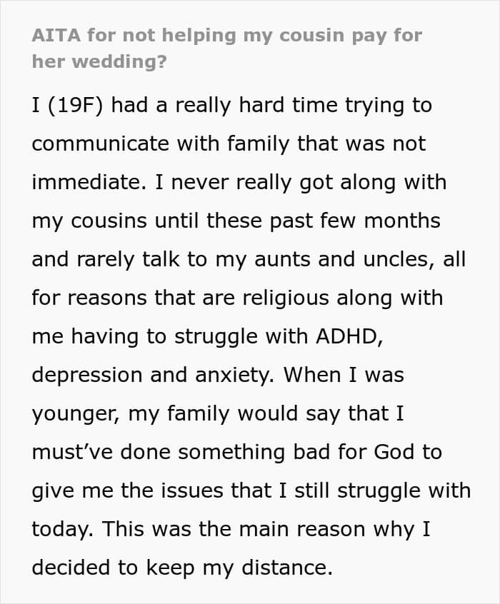 But this woman got a request to fund a wedding for a cousin with whom she wasn’t even close with