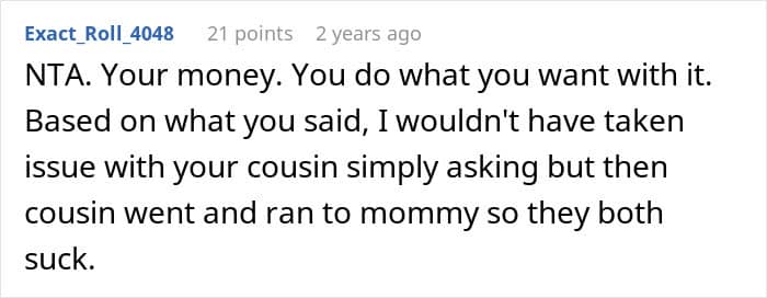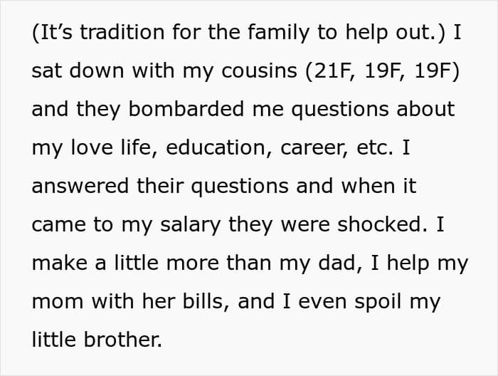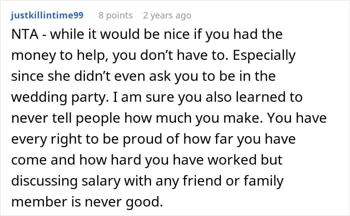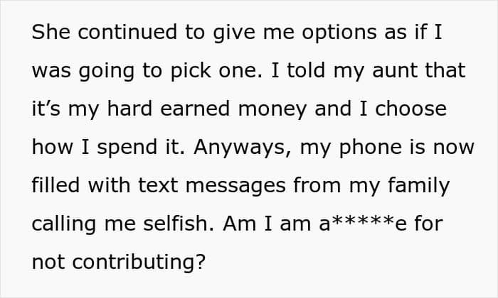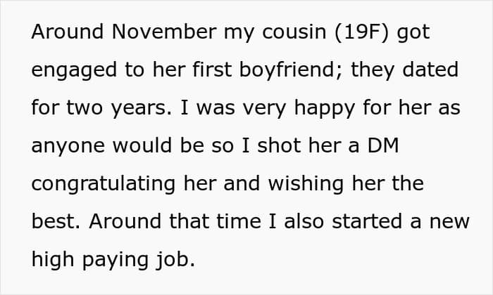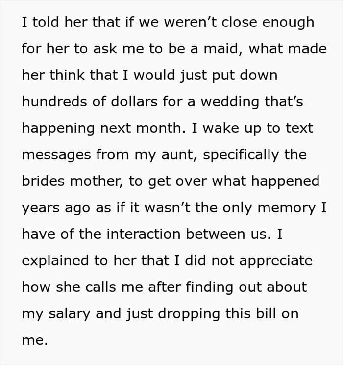 This young woman found herself in an argument with extended family members over her cousin’s wedding. After she revealed how much she was making, the aunt and cousin felt that the OP should fund the wedding. The user HumblePossibility548 went to the AITA subreddit to ask other netizens whether her decision to refuse was selfish.
