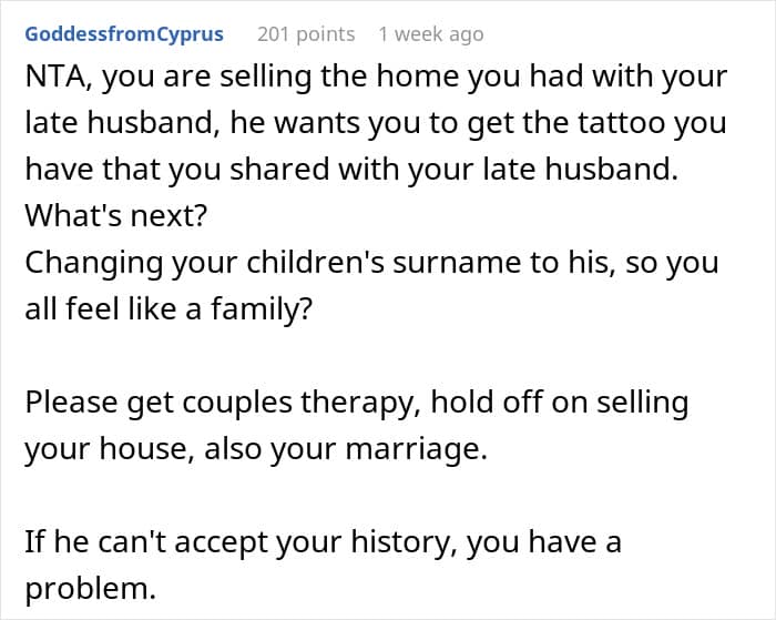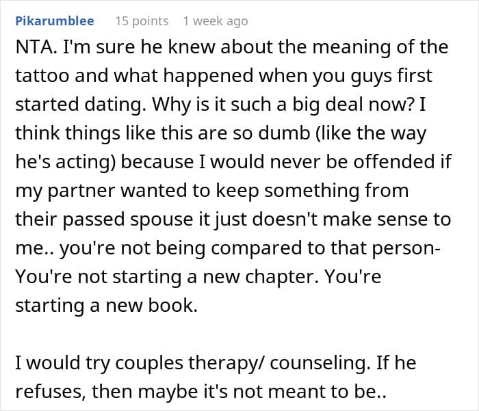 The expert adds that patience is important. “The fact that she didn’t throw the tattoo removal gift card in your face, shows she loves you and understands,” is what Randall would tell the man. “The circumstances of how the marriage ended were sudden and tragic. She still loves him and will go on loving him always. You must consider and accept this for your marriage to succeed.”