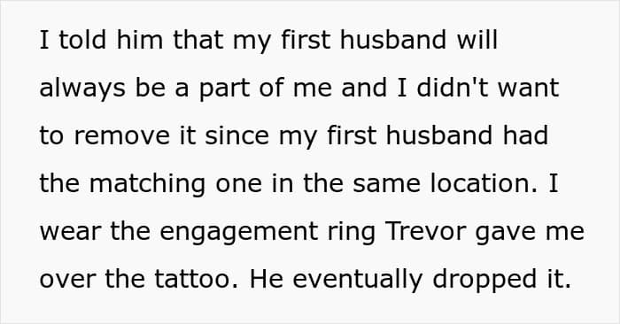 She says she understands why he might not want his future wife to have her ex-husband’s name on that symbolic finger. But suggests that Trevor buys her a wide wedding band.