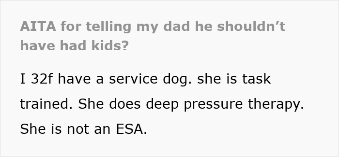 This is exactly what happened when a woman wanted to bring her service dog to her family’s Thanksgiving party, but wasn’t allowed to due to a scared relative. She felt so annoyed about it that she blew up at her dad.