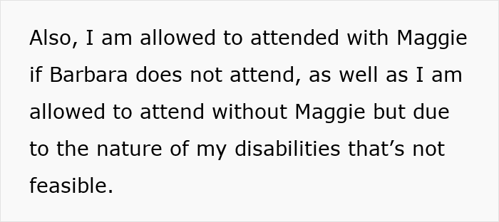 The woman shared that she wouldn’t be able to manage without her service dog, which is why she had to skip the family event every time to cater to her relative’s needs