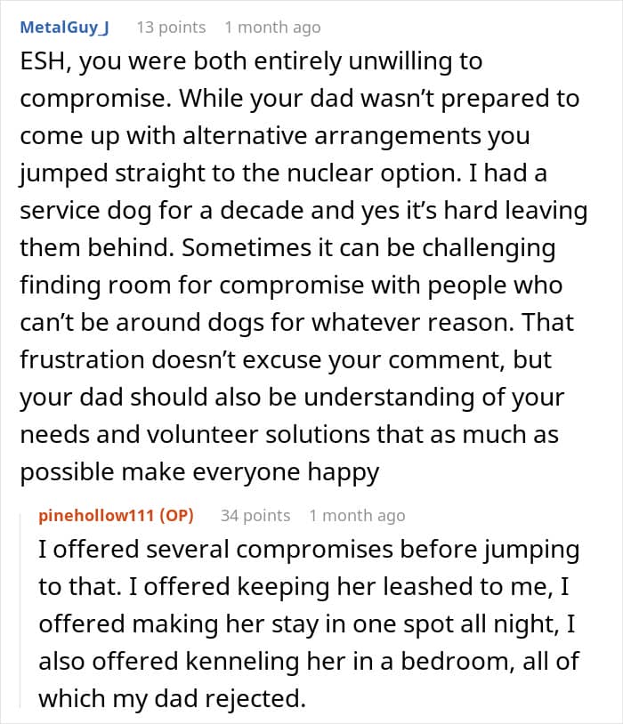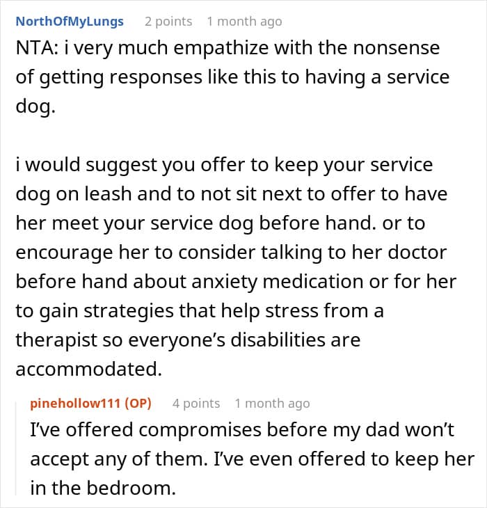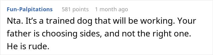 Instead of finding compromises for his daughter to attend, the poster’s dad told her not to come unless she could leave her dog behind