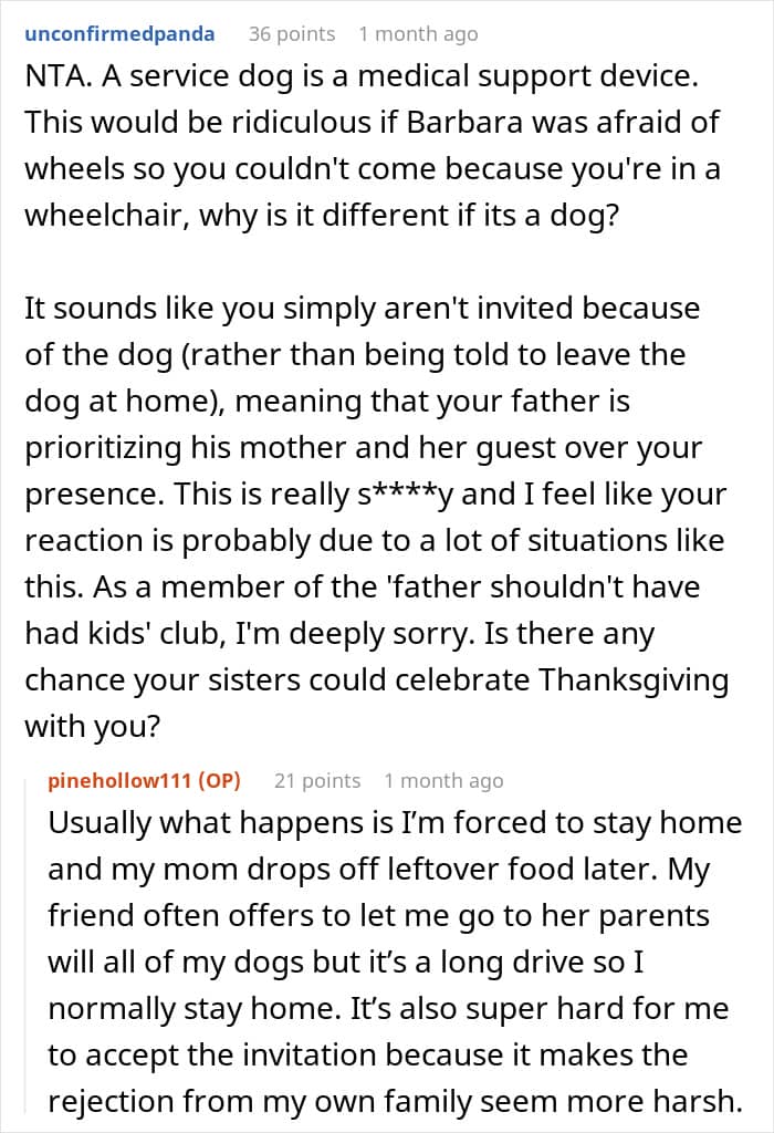 The poster shared that she and her service dog used to attend her family’s Thanksgiving until her grandma adopted an adult who was scared of dogs