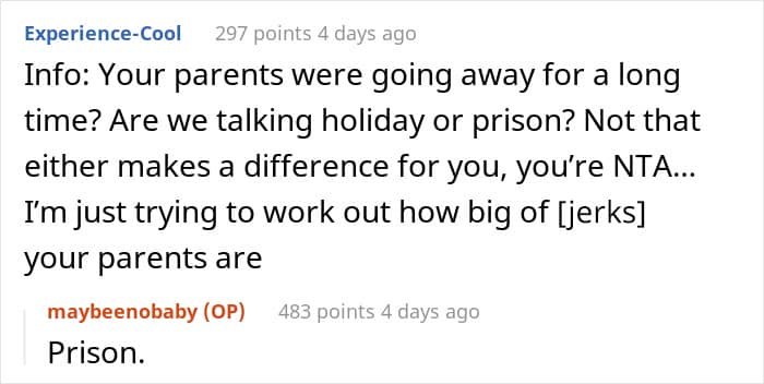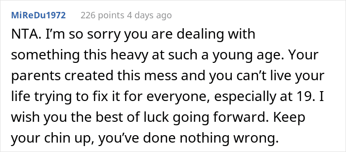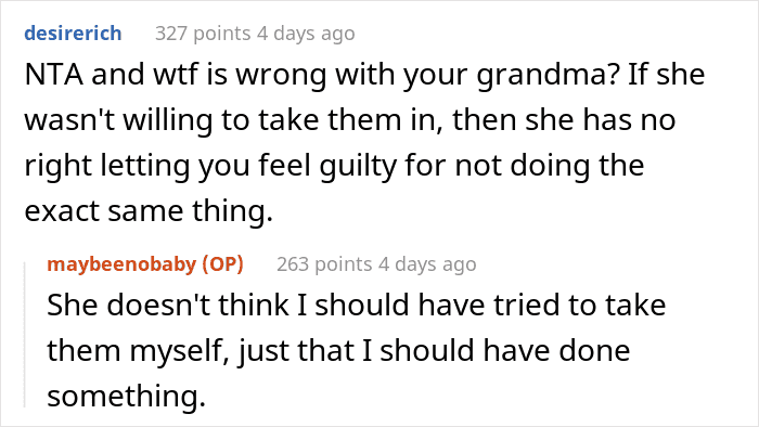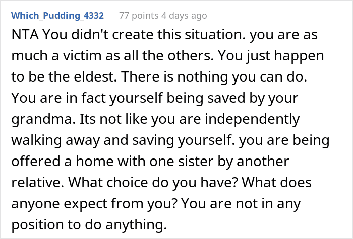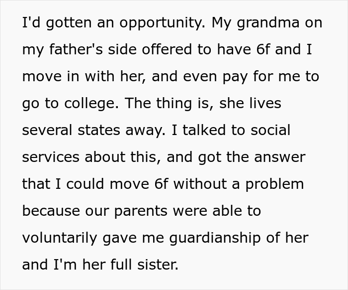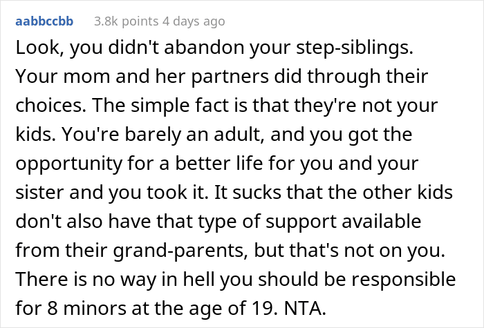 But now the author feels like there’s finally an opportunity “to have a better life,” so she decided to take the 6-year-old sister and move to another state. Meanwhile, the seven other siblings will have to go to foster care. Quite likely feeling rather guilty, Maybeenobaby wonders if she really made the right decision.