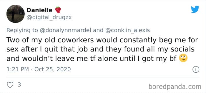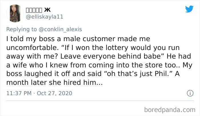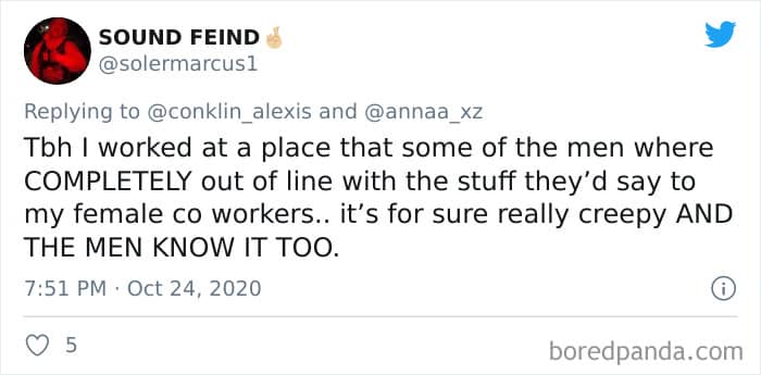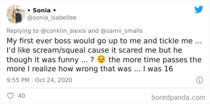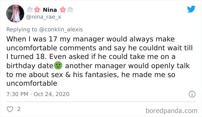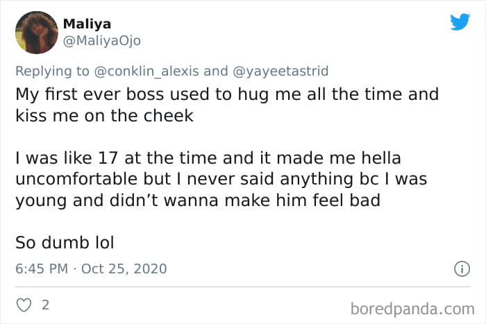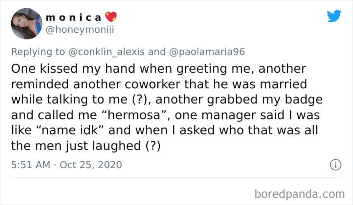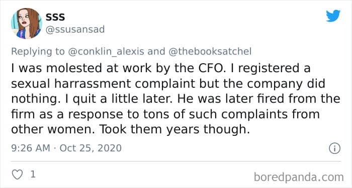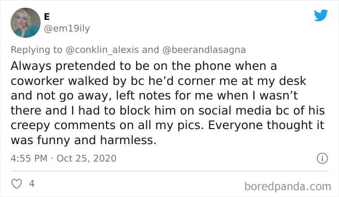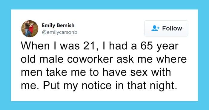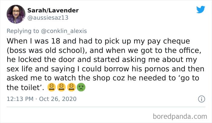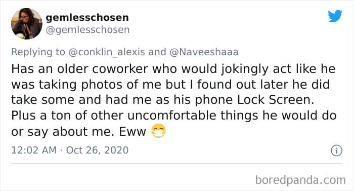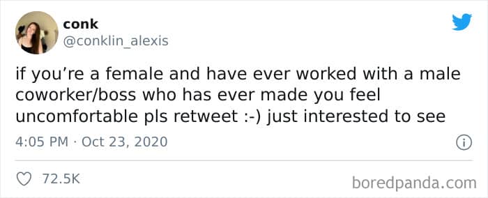 Twitter user Alexis Conklin started up a viral Twitter thread asking women to share the times that their male coworkers and bosses made them uncomfortable. Scroll down and have a read at the weird and creepy interactions, dear Pandas. And if you’re feeling brave, share if you’ve had similar experiences at the workplace in the comment section. Alexis’ thread got more than 72k likes and was retweeted over 95k times at the time of writing. This just goes to show that the discussion she sparked was relevant to a lot of people.