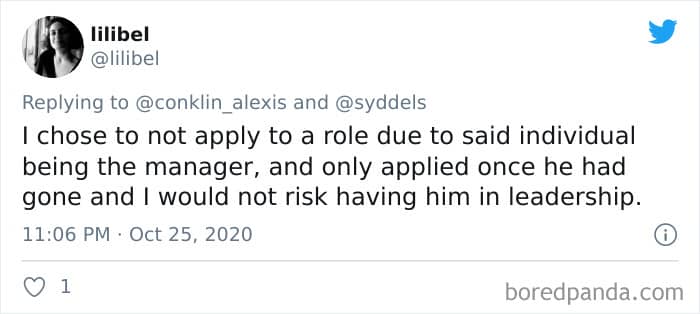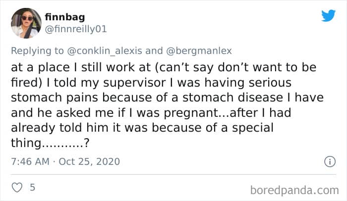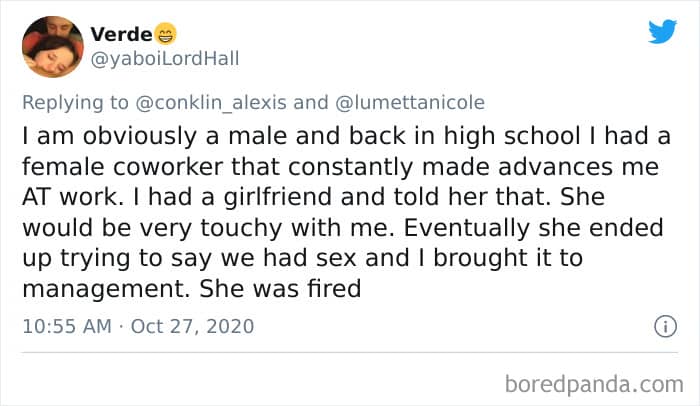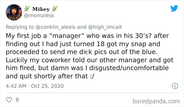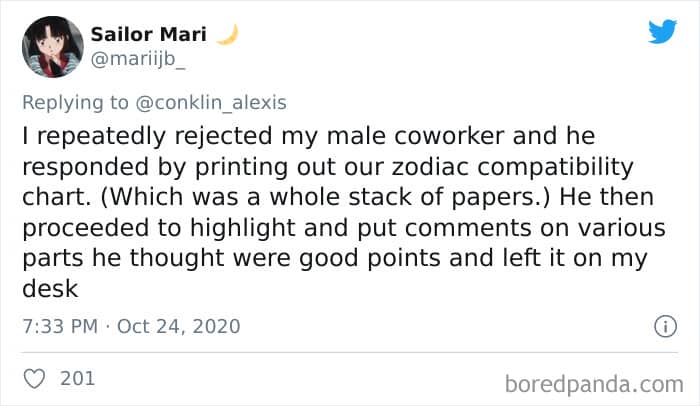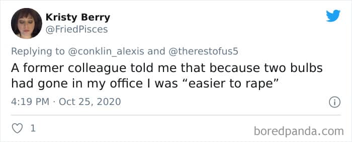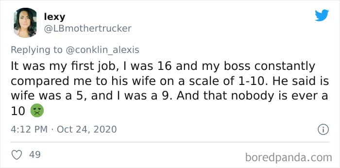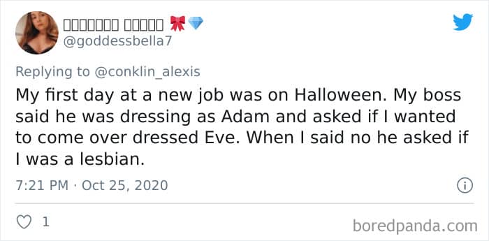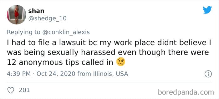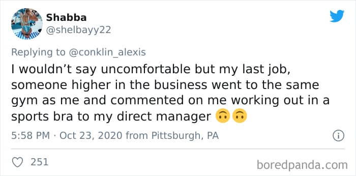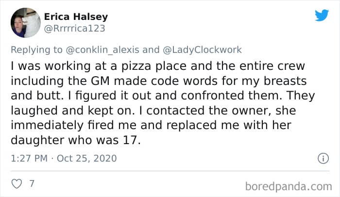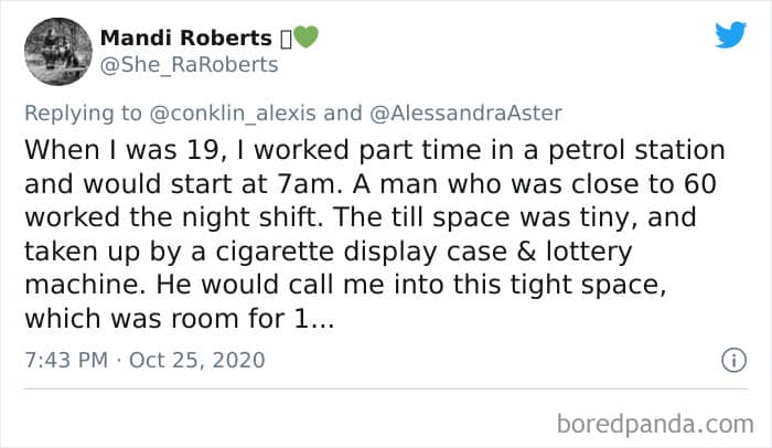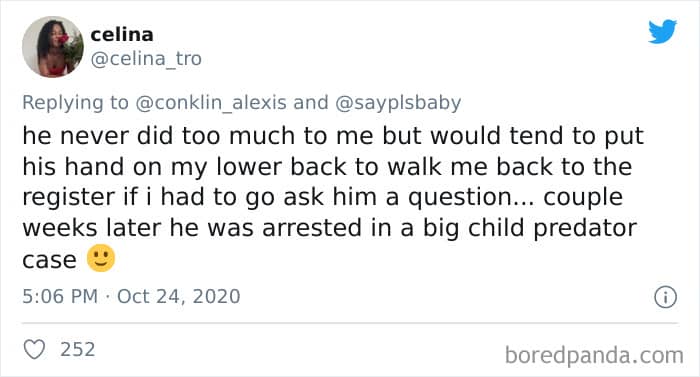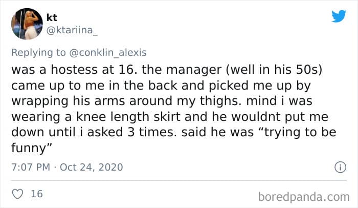 Twitter user Alexis Conklin started up a viral Twitter thread asking women to share the times that their male coworkers and bosses made them uncomfortable. Scroll down and have a read at the weird and creepy interactions, dear Pandas. And if you’re feeling brave, share if you’ve had similar experiences at the workplace in the comment section. Alexis’ thread got more than 72k likes and was retweeted over 95k times at the time of writing. This just goes to show that the discussion she sparked was relevant to a lot of people.