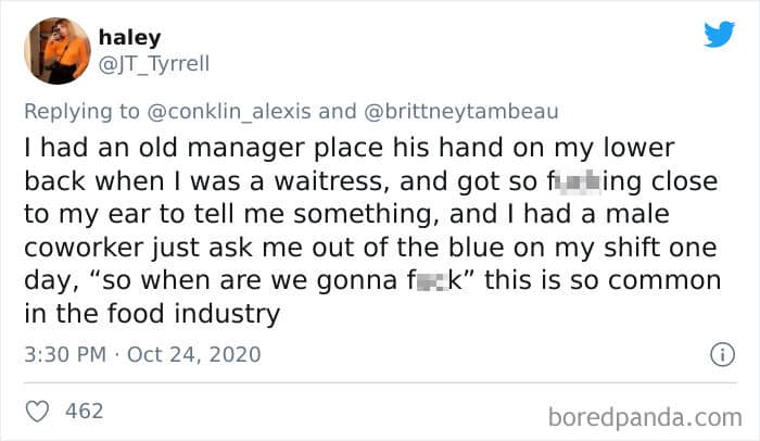 She was inspired to create the thread after talking with her other coworkers and friends in the food industry. “I think issues such as these are often swept under the rug and it is a conversation that needs to be talked about. Countless women said they were still made to work with their abuser after coming forward. Some women were fired by the manager who was sexually harassing after standing up for themselves. Some had to quit their jobs just to get out of the situation. All of which are completely unacceptable.”