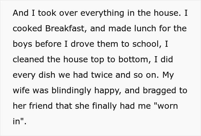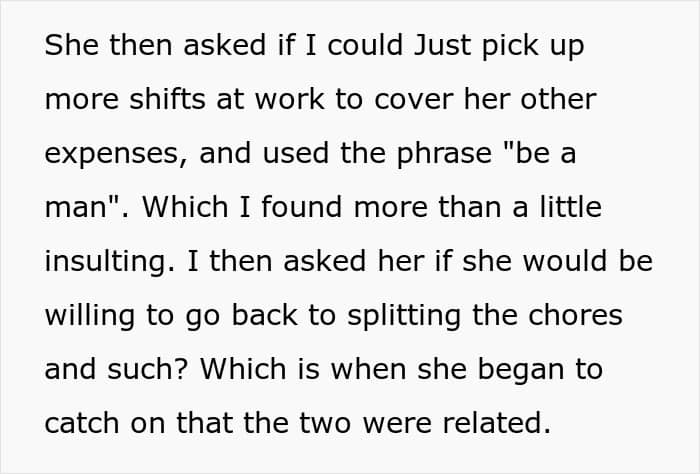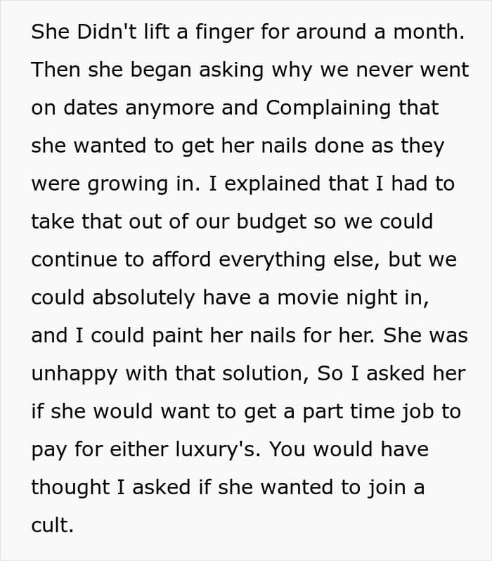 So after quite a few complaints from his wife that he doesn’t help at home, OP asked his boss to reduce his hours and took over everything at home. However, after a month of happiness at not needing to do anything, she started complaining about a lack of dates and wishes to get her nails done. Well, after explaining that he had to cut hours to take over the house chores followed suggestions to work more and ‘be a man.’