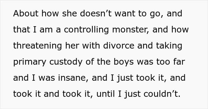 A few days later, OP posted an update sharing that he found out his wife was using substances. Numerous things have happened: he told their boys about the entire issue and forced her to message her supplier to end their friendship, which caused her to cry and scream for the entire ride to the treatment facility. She continued yelling that he was a controlling monster and so on.