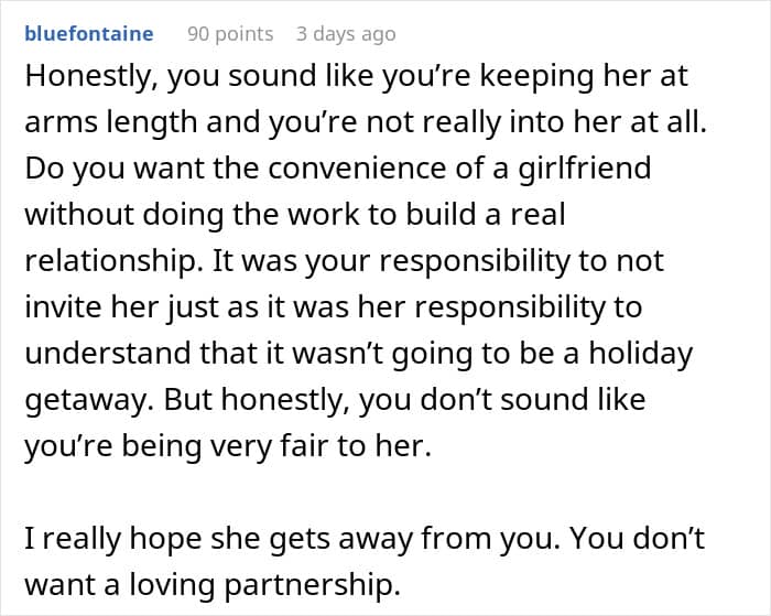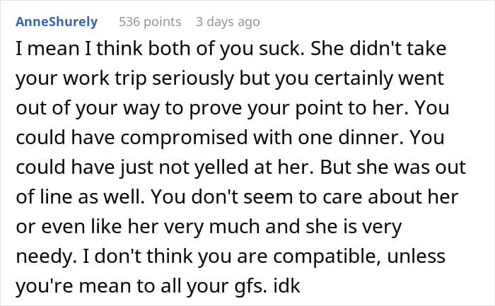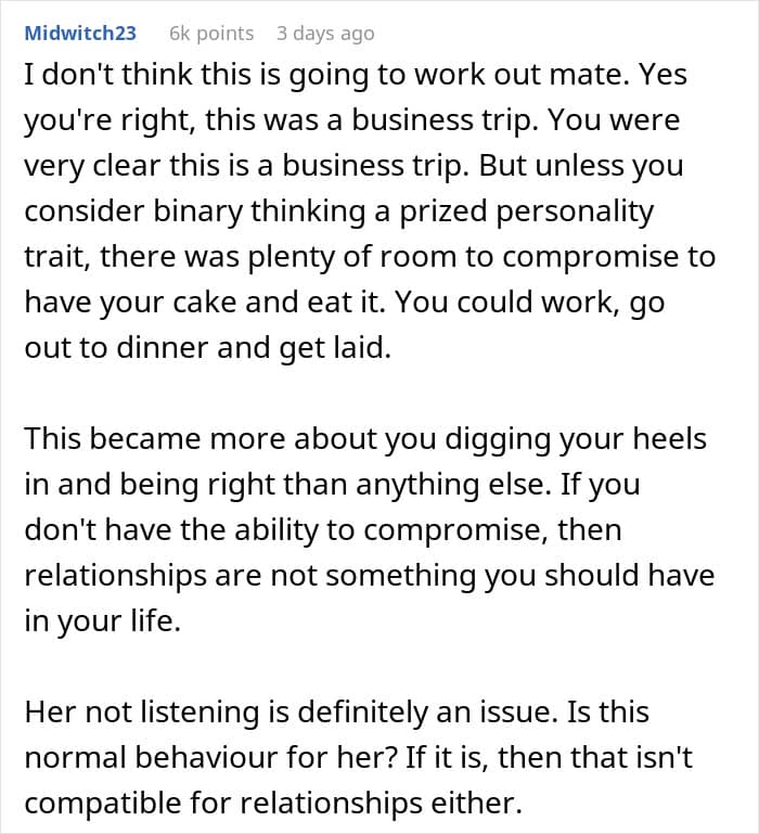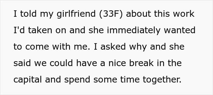 Communication is key to any relationship, but it can be pretty hard when one partner seems to only hear what they want to hear. A man asked the internet for some advice after getting into an argument with his new girlfriend. She decided to tag along on a work trip he was taking, despite his many warnings that it was just that, a work trip.