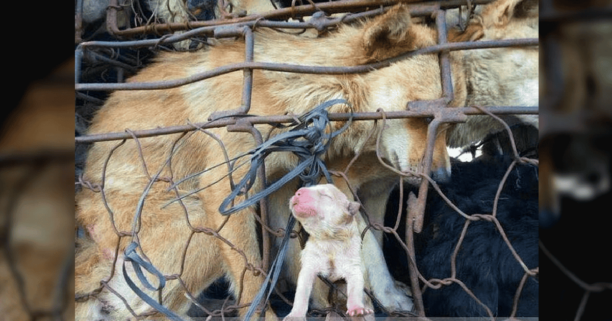 Touching love Mother dog tries to push puppy out of cage to slaughterhouse causing fever