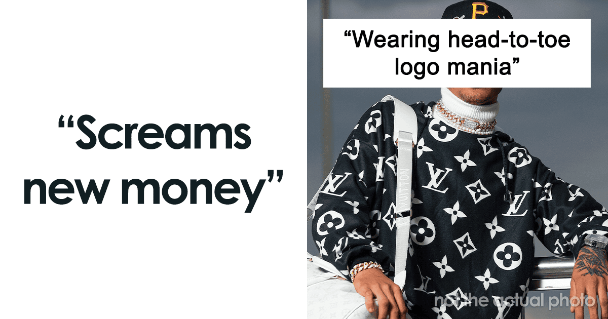 SCREAMS NEW MONEY: “Wearing head-to-toe logo mania — only buying designer items that CLEARLY have the name front and center. For example, my roommate got a pair of Burberry track pants that are a bright blue, sports material, button up the side, with only ‘Burberry’ written above one of the back pockets. Super cute for her, but she was out with a guy wearing a Burberry button-down who made some slick comment about her being dressed down. She said, ‘Well, we both got the Burberry memo,’ and he was too stunned to speak lol.