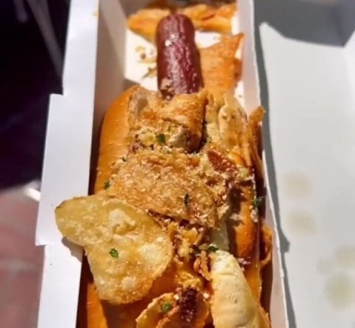 So first we start off with this f*****g hot dog that got hammered and then covered in chips. Charged her 15 bucks for it.