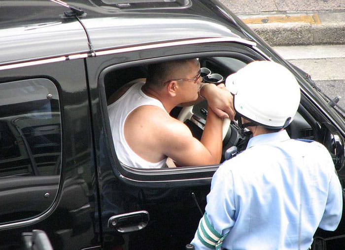 I was walking down a main street in Kyoto on a sunny summer day. Up ahead I see a police car and a policeman and a long folding table on the sidewalk. As I approached, I saw the policeman was flagging down certain drivers with his gloved hand. The drivers pulled over, quietly got out of their cars and calmly took a folding chair at the table.